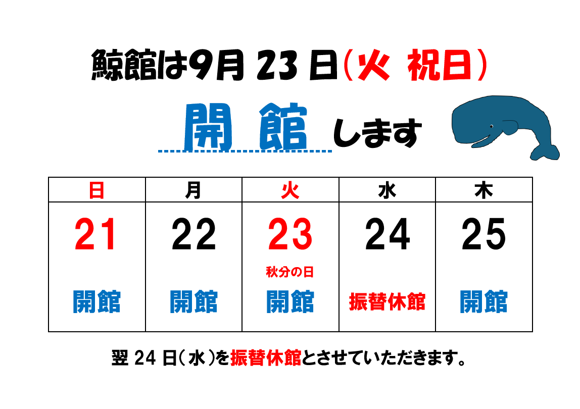 9月第4週の鯨館の開館日についてのお知らせです。