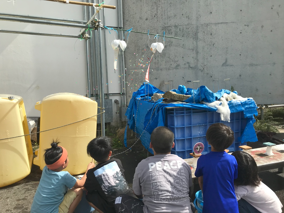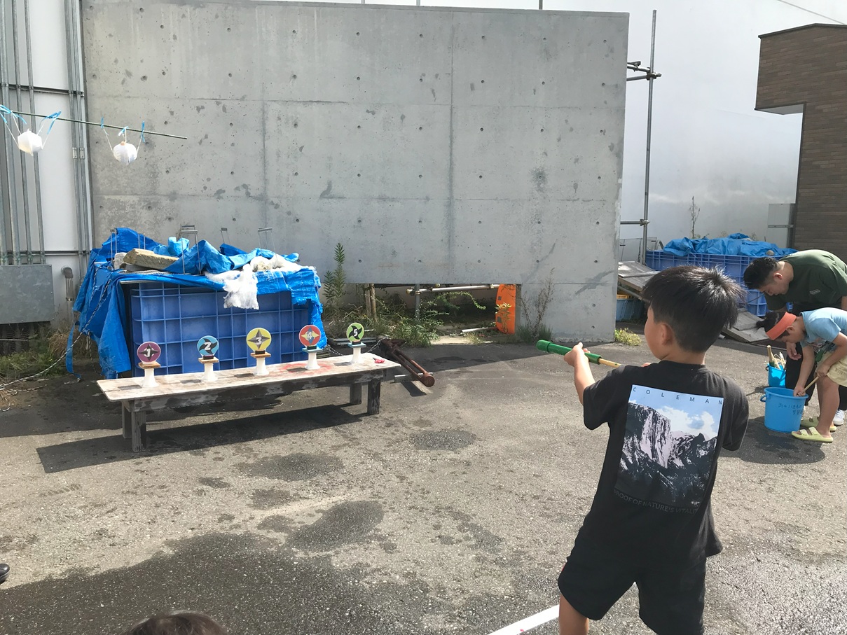 遠くまで水を飛ばす競争や、的当て、くす玉当てなどみんなで楽しく遊びました。