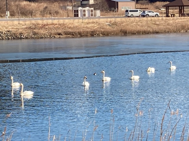 入江田沼では寒さで沼が半分凍り、少し狭そうにしながら白鳥が仲良く泳いでいました。
