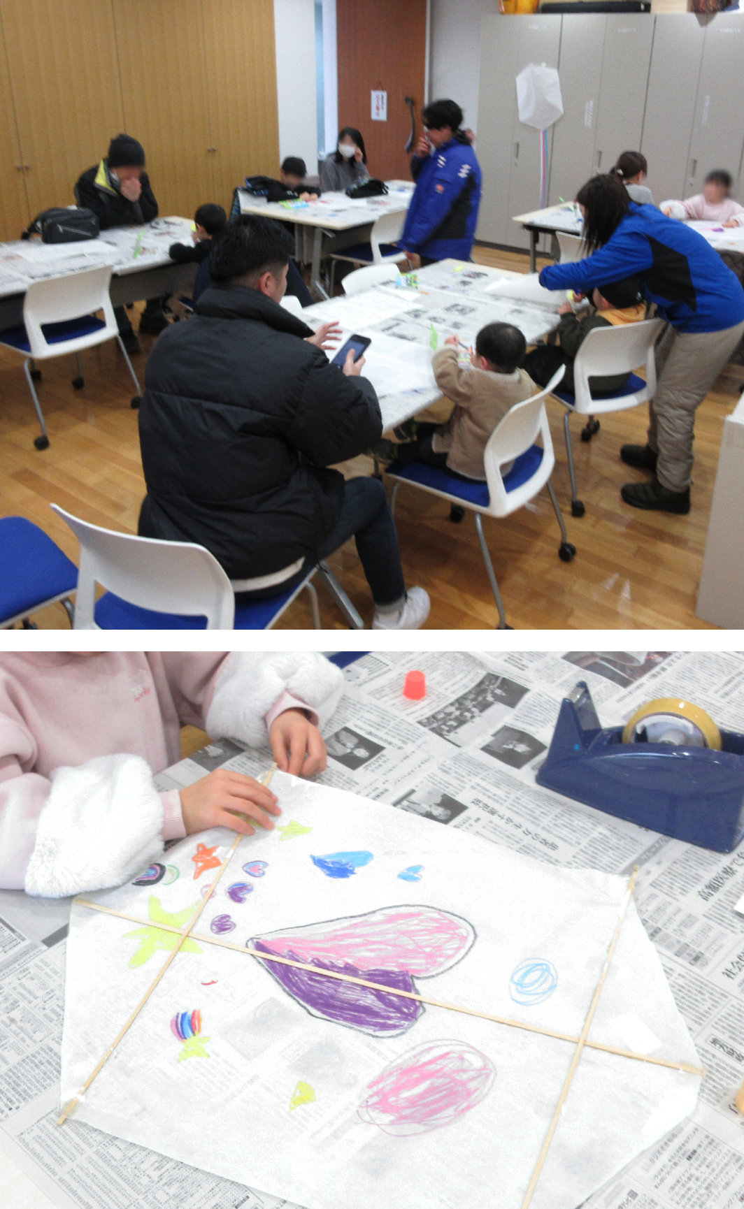 前半は凧作り、和紙を切ったり絵を描いたり竹ひごを付けたりして凧を作っていただきます。完成したら早速外であげてみます。