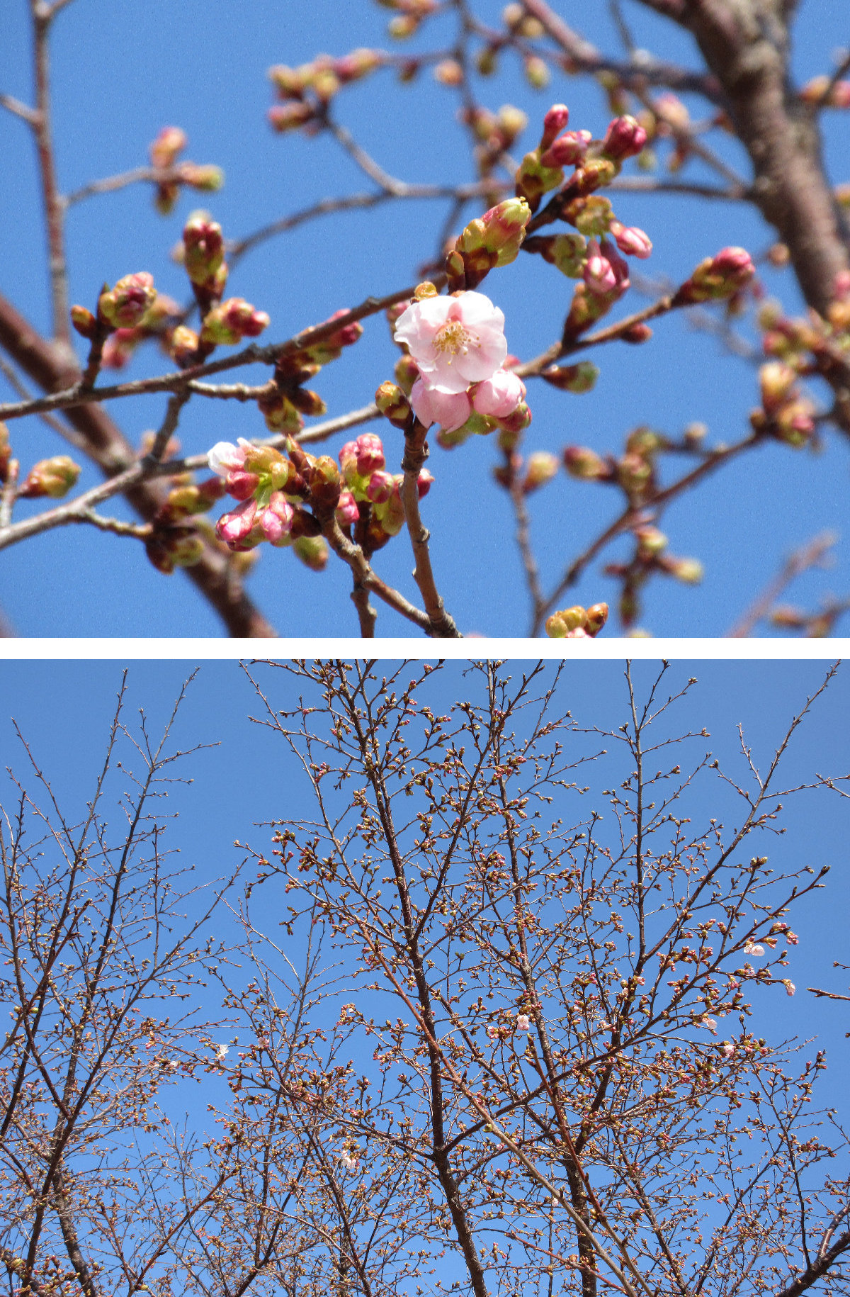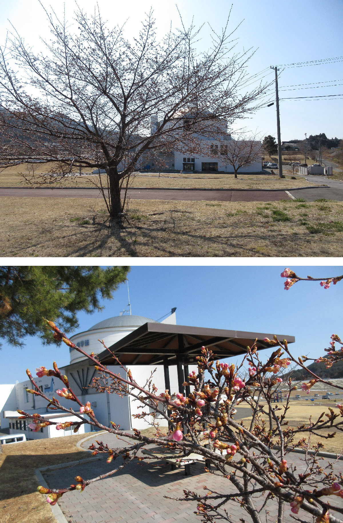 さて今日の鯨館の周りの桜状況ですが、ここ最近あまり暖かくなかったためか前回とあまり変わらず、海側の桜の木1本が数輪咲いているにとどまります。小高い東屋側の小さな河津桜も蕾がほころんでいる状態です。けれども足元の枯芝生の中にオオイノフグリやハコベの花が点在していて、ゆっくりですが着実に春が来ているのだなと思いました。